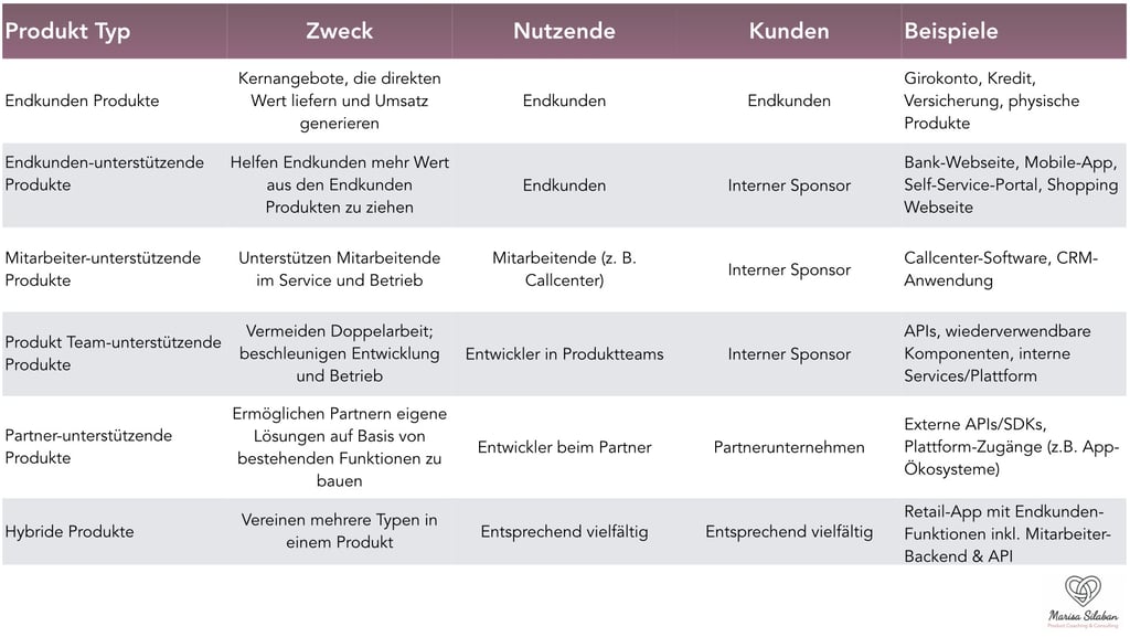 Zusammengefasst eine Gegenüberstellung der sechs Produkt-Typen: