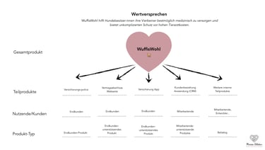 Der Gedanke von Wert für Kund:innen und Nutzer:innen steht für das Gesamtprodukt. Das Gesamtprodukt wiederrum besteht aus vielen Teilprodukten, um insgesamt den Wert zu erbringen. Ich habe gute Erfahrungen damit gemacht, das Gesamtprodukt nicht wie das Produkt selbst zu nennen, sondern den Wert, positiv konotiert, auf Papier zu bringen.